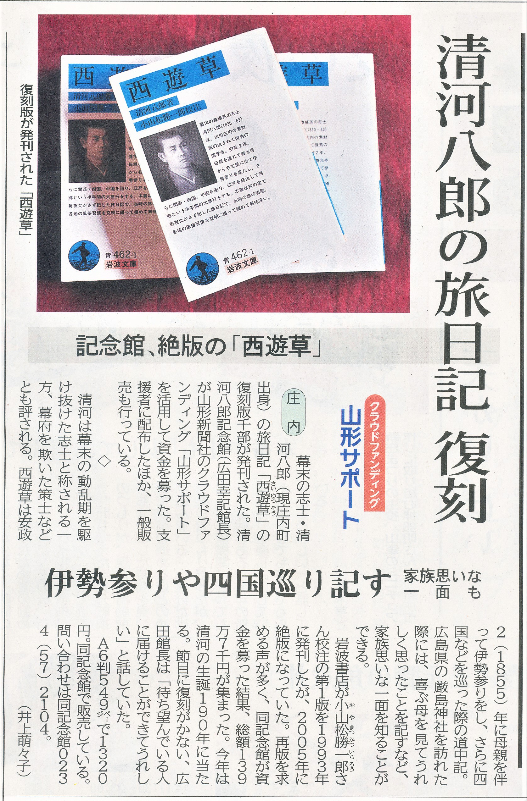 なお今年は清河八郎生誕190年の記念すべき年であり、また今年3月末まで行っていた西遊草復刻版刊行クラウドファンディング事業の成功を感謝しての特別企画展として、「『西遊草』・奉母行、伊勢参りの旅日記(仮称)」と題して6月上旬からパネル展を予定しております。