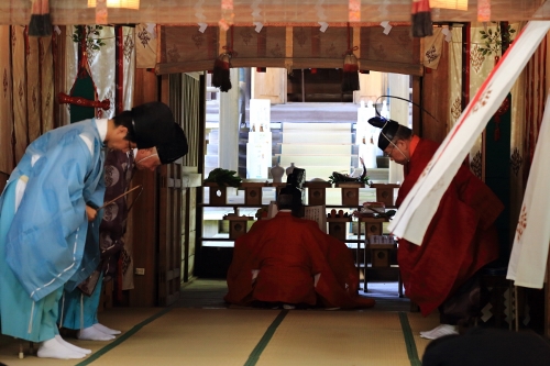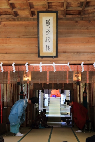 本殿の扉を開け祭神を招き入れる開扉の義。「お~~~お~~~」の警蹕(けいひつ)の声が響きます。