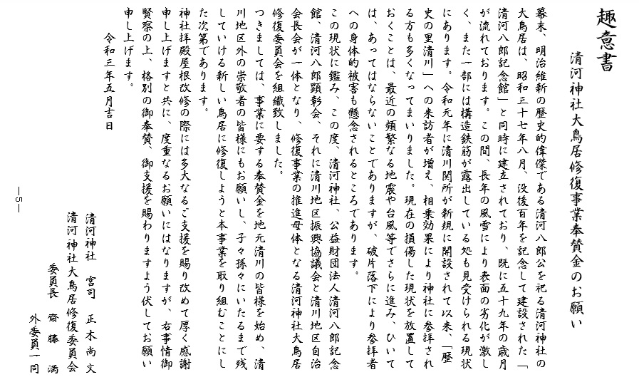 平成31年4月に「荘内藩清川関所」がオープンしたことにより、「歴史の里清川」への来訪者が増え、相乗効果により記念館入館者(令和元年度対前年比114%)や神社への参拝者も増えております。鳥居が劣化した現状を放置することは、破片落下により人的被害を及ぶすことも懸念されることから、神社役員において令和3年2月に修復の必要が協議され、事業推進のための組織造りを検討しました。